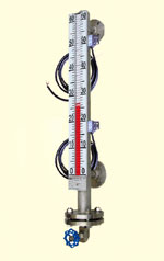 控制型是在翻柱液位計的基礎上增加了磁控開關,在監測液位的同時磁控開關信號可用于對液位進行控制或報警;遠傳型是在翻柱液位計的基礎上增加了 4~20mA 變送傳感器,在現場監測液位的同時將液位的變化通過變送傳感器、線纜及儀表傳到控制室,實現遠程監測和控制。