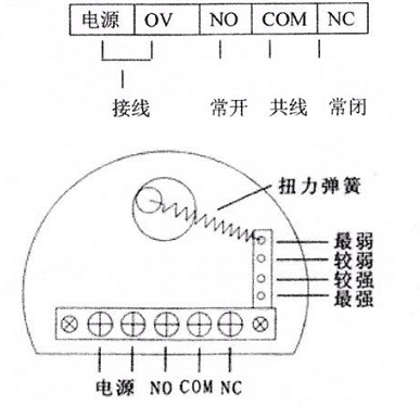 2.具體方法:打開(kāi)接線盒,將扭力彈簧靠近多孔一端拿出,根據(jù)需要插入對(duì)應(yīng)的孔中(靠近端子臺(tái)的孔扭力最弱)。