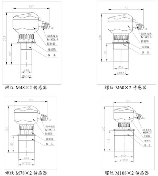 SKCYW系列超聲波液位計 ; SKCYW系列超聲波液位計是由微處理器控制的數字液位儀表。在測量中脈沖超聲波由傳感器發出,聲波經液體表面反射后被同一傳感器接收并轉換成電信號。超聲波液位計具有自動功率調整,溫度補償,抗干擾等功能。由于采用非接觸測量,被測介質幾乎不受控制,可廣泛應用于水環境、酸堿、泥漿、食品等多種環境。 1、測量流量、液位、低表壓、真空和比重 2、兩線制最大量程可達30m 3、四線制最大量程可達40m 4、最小分辨率1mm 5、LCD/LED大顯示屏 6、智能信號處理技術 7、配有高低位雙繼電器(僅四線制) 8、全塑料防腐外殼(防護等級lP67) 9、換能器結構(小量程物位計法蘭安裝時,對法蘭接管長度無要求) 10、簡單的按鍵設定參數(無需等待容器排空或加滿,無需附加的遙控器) 11、靈活的安裝方式(螺紋/法蘭、固定孔/支架) 螺紋尺寸:M48*2 M60*2 超聲波液位計技術參數