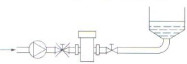 電磁流量計聚四氟乙烯襯里傳感器的安裝 用聚四氟乙烯(PTFE)管材做的電磁流量計的傳感器襯里,它與傳感器測量管管壁一般不粘貼,因此,對真空負壓是敏感的。管道內真空會抽癟聚四氟乙烯襯里,使襯里呈波浪型拱起——典型的負壓破壞形態,這樣破壞了電極的密封,傳感器就不能工作了。因此,PTFE襯里的傳感器不能用于負壓系統,也應盡可能避免安裝在可能產生瞬間負壓的地方。如傳感器不應裝在泵的吸入端;閘閥應裝在傳感器的后側,如圖所示。