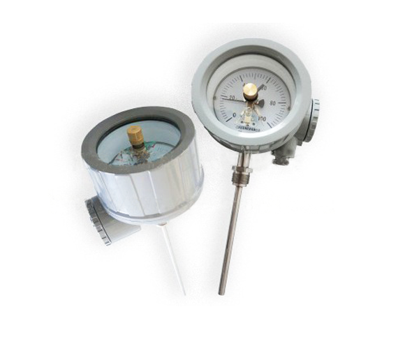 防爆電接點雙金屬溫度計帶有電接觸裝置—即機械電接點。當被測介質溫度變化時,自由端上的細軸及轉向傳動機構帶動指針及動觸點轉動,在標度盤上指示出溫度的變化值,當其與定觸點(上、下限定觸點)接觸或斷開的瞬時,使電路系統中的繼電器及接觸器動作,以達到自動控制和報警的目的。