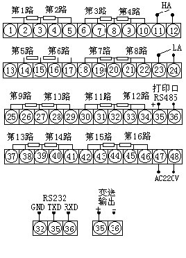 報警輸出: ⑴1-64通道統一上下限報警,繼電器輸出觸點容量 AC220V/3A