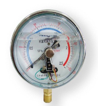 在電接點壓力表裝置的電接觸信號針上,裝有可調(diào)節(jié)的永久磁鋼,可以增加接點吸力,加快接觸動作,從而使觸點接觸可靠,消除電弧,能有效的避免儀表由于工作環(huán)境振動或介質(zhì)壓力脈動造成觸點的頻繁關斷。所以電接點壓力表具有動作可靠、使用壽命長、觸點開關功率較大等優(yōu)點。